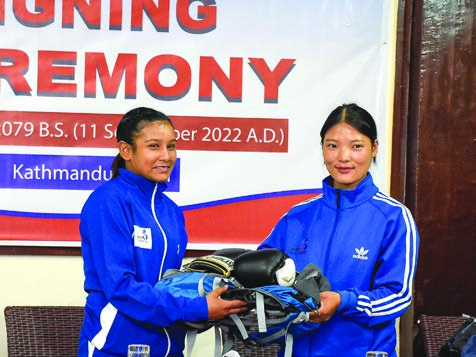 As per the agreement, the Foundation will provide Tamang with boxing gears for her international participations along with Rs 15,000 per month. First scholar of the Foundation, wushuka Nima Gharti Magar handed over kits to Tamang.